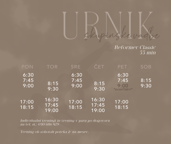 Že vrsto let preizkušam različne vadbe, a le pilates na reformerjih me je zares osvojil. Njegova učinkovitost, eleganca gibanja in pozitiven vpliv na telo so me navdušili do te mere, da sem se odločila svoje znanje poglobiti in ga deliti z vami. Skozi različne tečaje in izobraževanja sem se temeljito pripravila, da vam lahko ponudim kakovostno, varno in prilagojeno vadbo, ne glede na vašo telesno pripravljenost. Moj cilj je, da se v vsakem treningu počutite dobro, napredujete in vzljubite reformer pilates tako kot jaz. Obožujem šport in modo, zato v moji vadbi ne bo manjkalo stila, motivacije in dobre energije, ki jo bom delila z vami. Pridružite se mi in skupaj bomo oblikovale močno, gibčno in usklajeno telo!